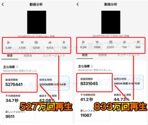 以下はTikTokのクリエイターツールの動画解析画面の一部ですが、ミリオン(再生回数100万回以上)を連発しているのがわかります。