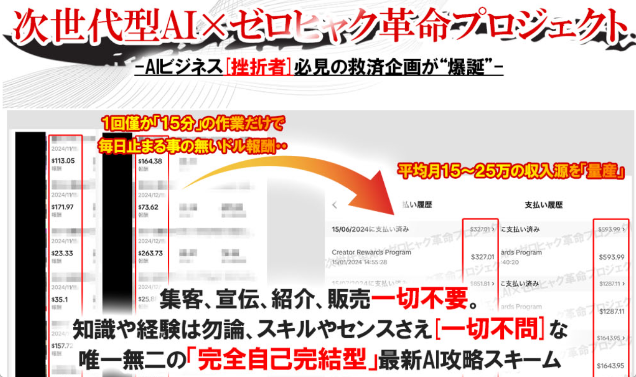 今回紹介する「次世代型AI×ゼロヒャク革命プロジェクト」が提示しているスキームは、まさにそんな初心者ならではの壁を殲滅したビジネスモデルになっているんです。